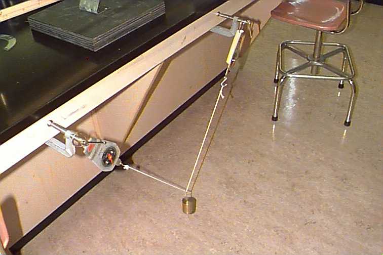 Setup the experiment as in the figure with a 500g mass. Arrange the mass such that the experiment is not symmetric (length and angle of string to each side is different).