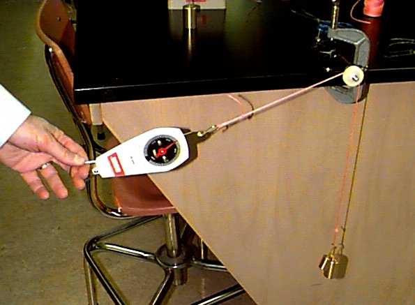 Setup a scale with a 1000g mass over a pulley as shown in the picture. Vary the angle the scale/string makes with the pulley and observe the scale reading.