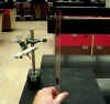 Setup the small laser so that it points from one end of the bench top to the top of the pipe going into the ceiling from your bench. Use a meter stick to measure the beam height at one place. Also measure the horizontal distance from the laser to your height measurement, and laser to the pipe. You will also need to measure the height from the table top to the laser to use in your calculations.